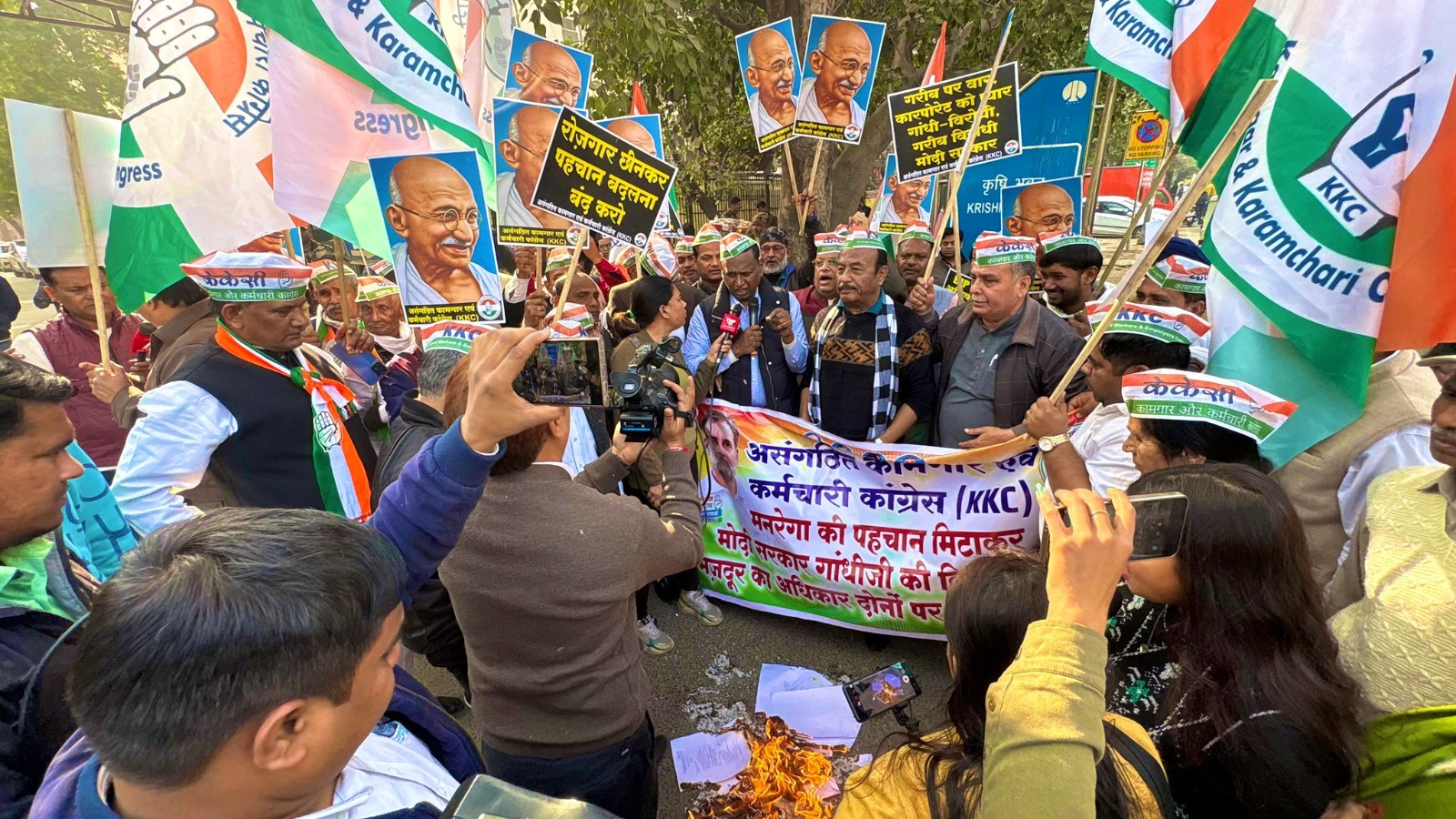 नई दिल्ली, 17 दिसंबर, 2025. मनरेगा खत्म करने की 'साजिश' के खिलाफ असंगठित कामगार एवं कर्मचारी कांग्रेस (केकेसी) द्वारा दिल्ली के कृषि भवन पर ...