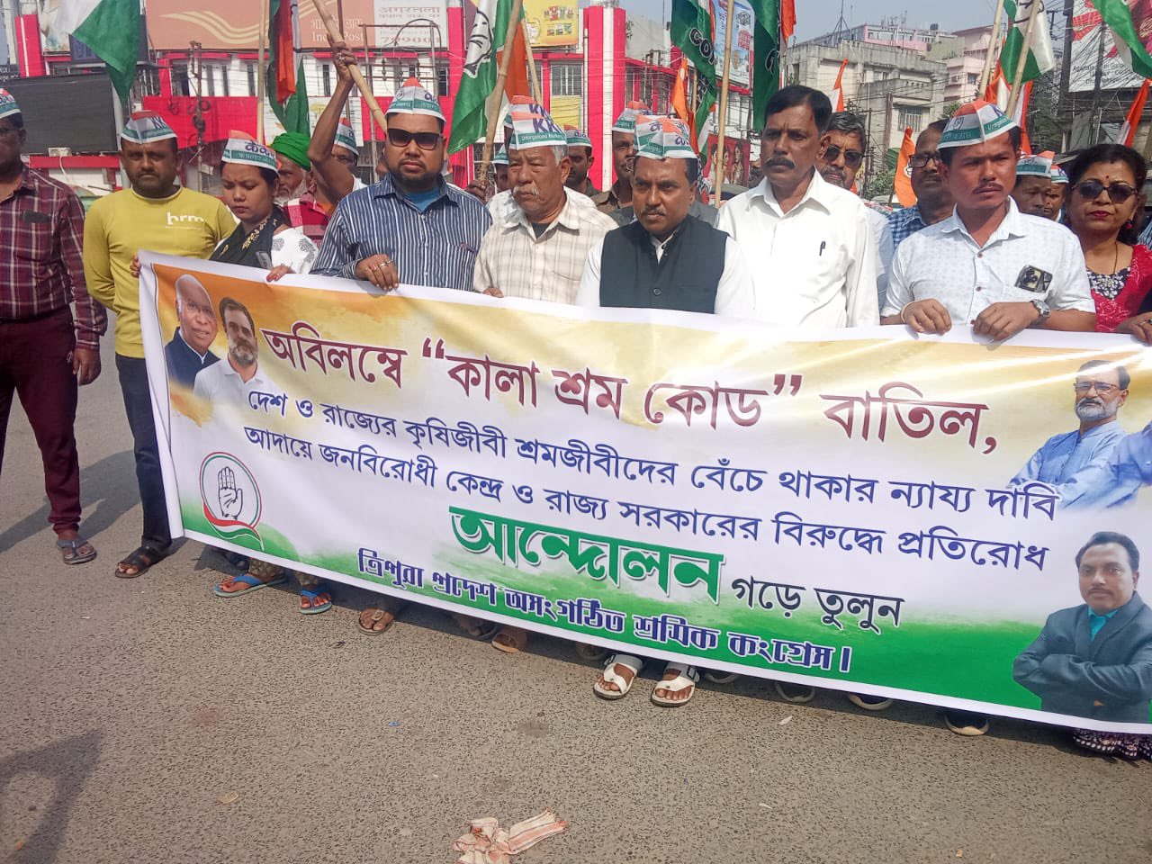असंगठित कामगार एवं कर्मचारी कांग्रेस (KKC) के प्रदेश चेयरमैन श्री शांतनु पाल के नेतृत्व में अगरतला लेबर कमिश्नर कार्यालय पर एक प्रखर और संगठित विरोध प्रदर्शन आयोजित किया गया। इस प्रदर्शन में KKC के सैकड़ों साथी शामिल हुए, जिन्होंने केंद्र की BJP सरकार द्वारा लागू किए जा रहे श्रमिक-विरोधी, कॉरपोरेट-सहायक 4 लेबर कोड्स के खिलाफ अपनी तीखी आपत्ति दर्ज कराई।